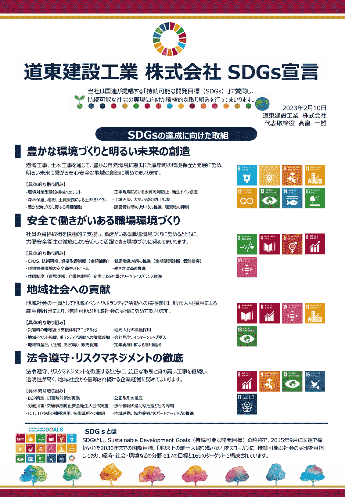 この度、当社は国連が提唱する「持続可能な開発目標(SDGs)」に賛同し、持続可能な社会の実現に向けた積極的な取り組みを行ってまいります。